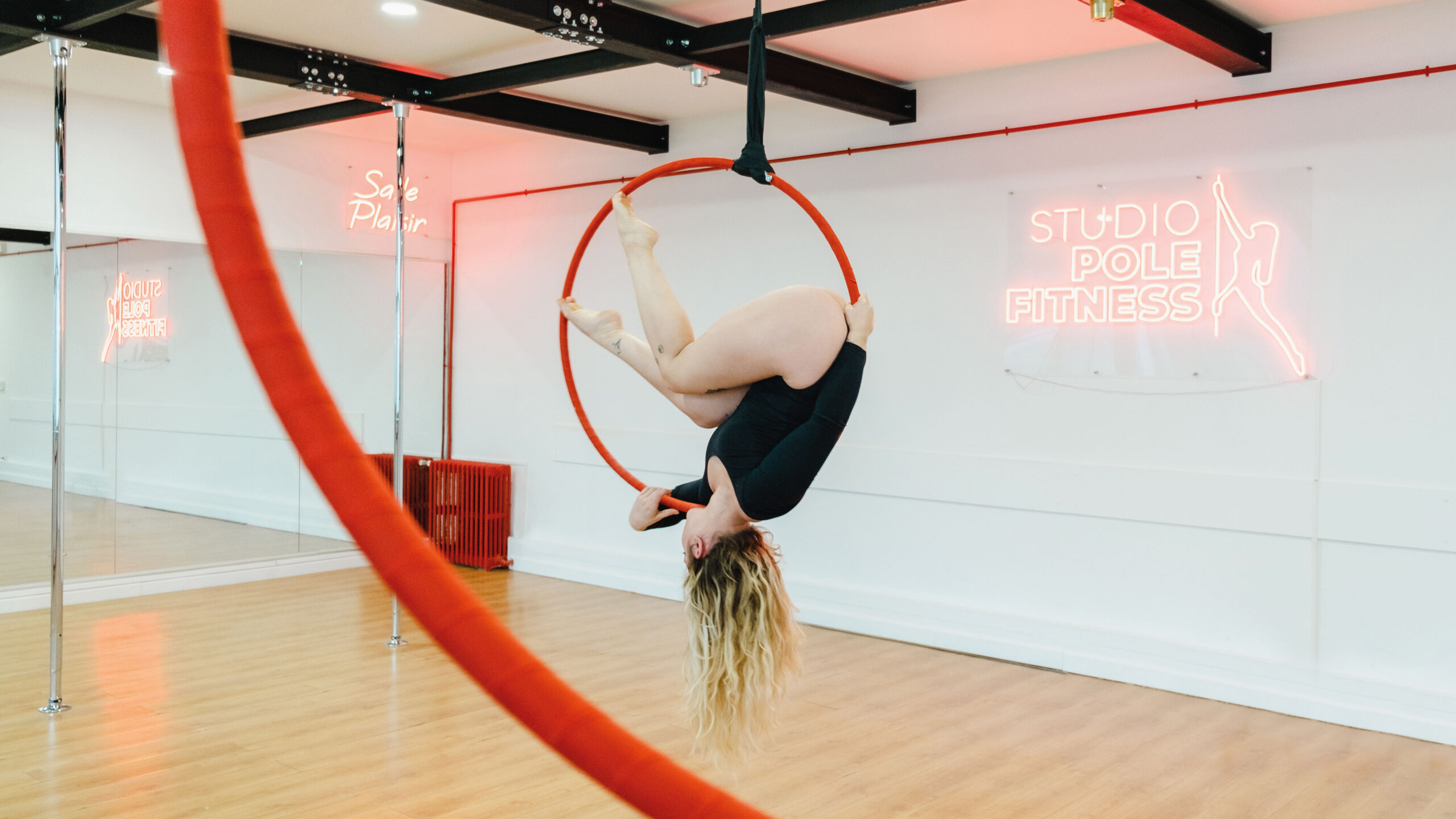 Noémie est une artiste aérienne touche à tout, spécialisée dans le cerceau et le tissu aérien mais pratiquant également la corde lisse, les sangles ou encore le trapèze.